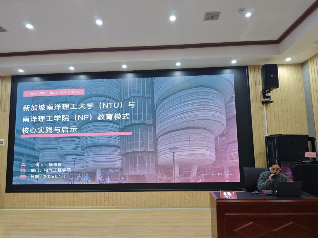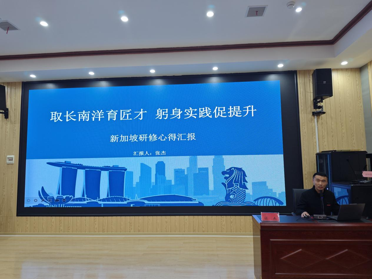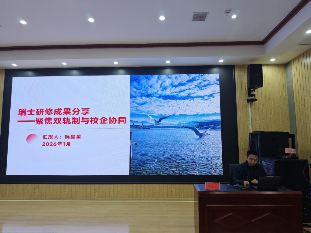 1月16日下午,在新二实训楼二楼思政大讲堂,学校隆重举办2025-2026学年秋季学期青年骨干教师出国研修成果分享专题教研活动,研修归来的张杰、杨青青、阮星星、李佳铭四位老师分享了研修成果。来自各教学部门的近百名教师代表参会。