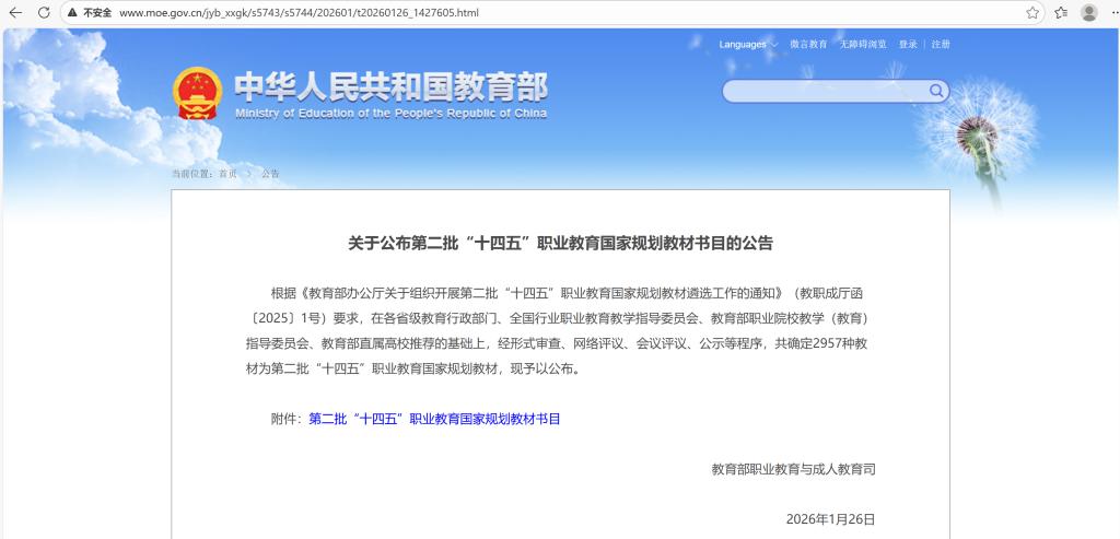 据了解,本批次“十四五”职业教育国家规划教材书目共遴选出来自全国近1400所职业院校的教材共2957种,充分彰显了近年来我国职业教育教材建设的重要成果。