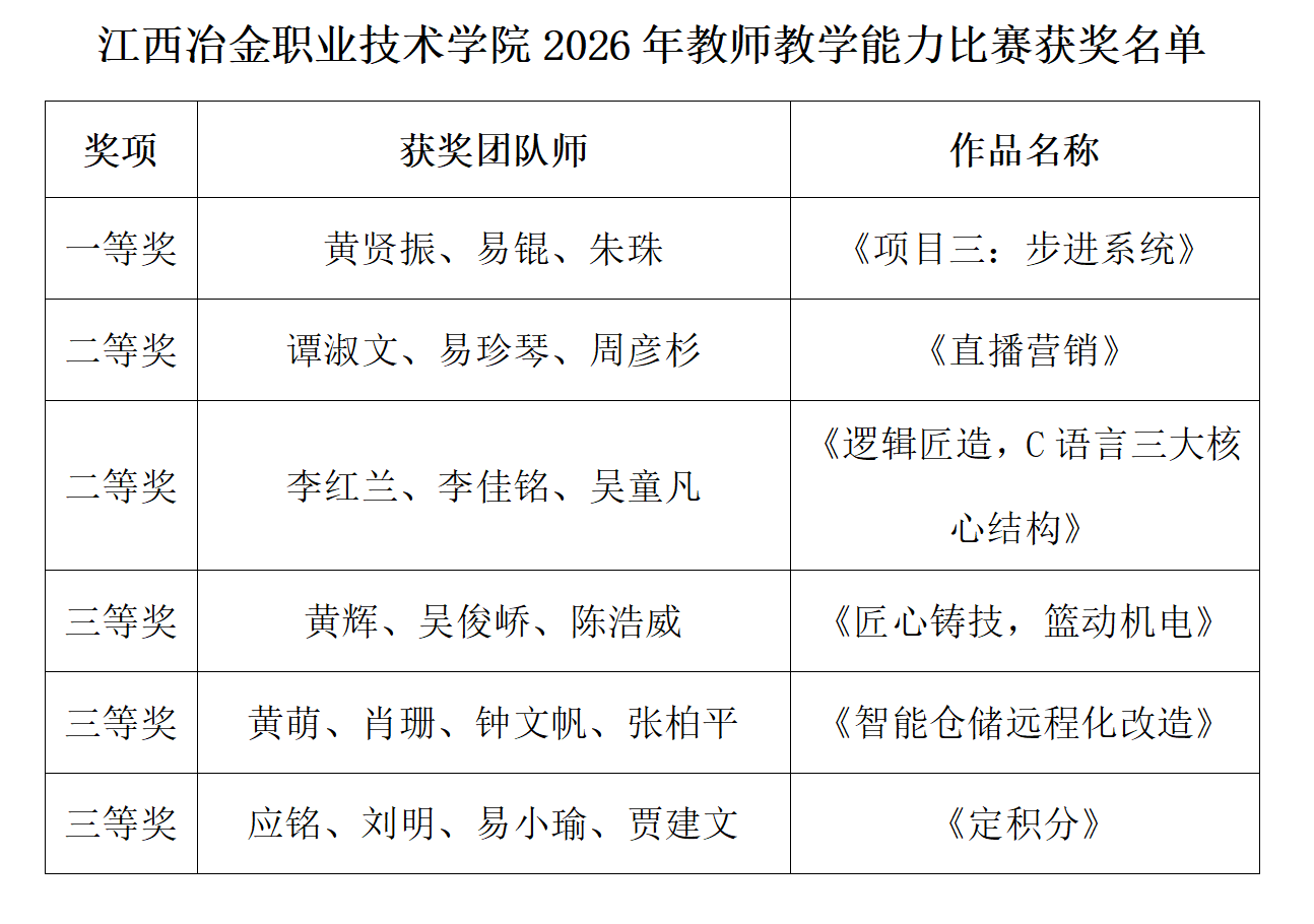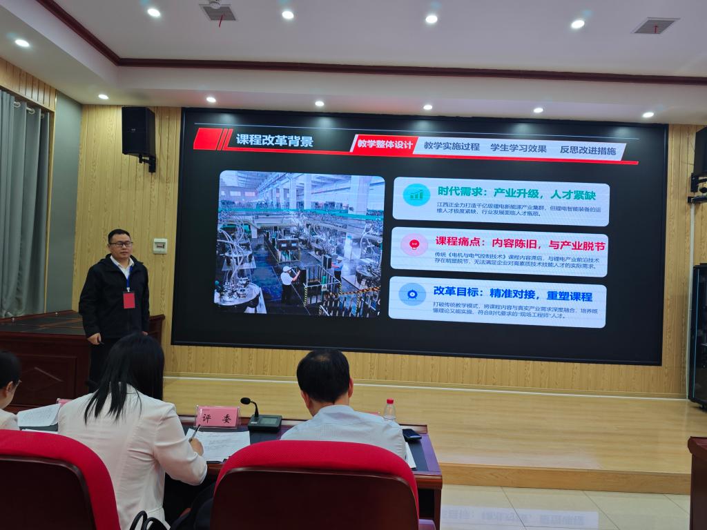 4月17日,在新二实训楼二楼思政大讲堂,学校2026年教师教学能力大赛成功举办。大赛依据江西省职业院校技能大赛工作要求,对标省赛标准,赛出了较高水平,评出一等奖一名、二等奖二名、三等奖三名。黄贤振教师团队获一等奖。