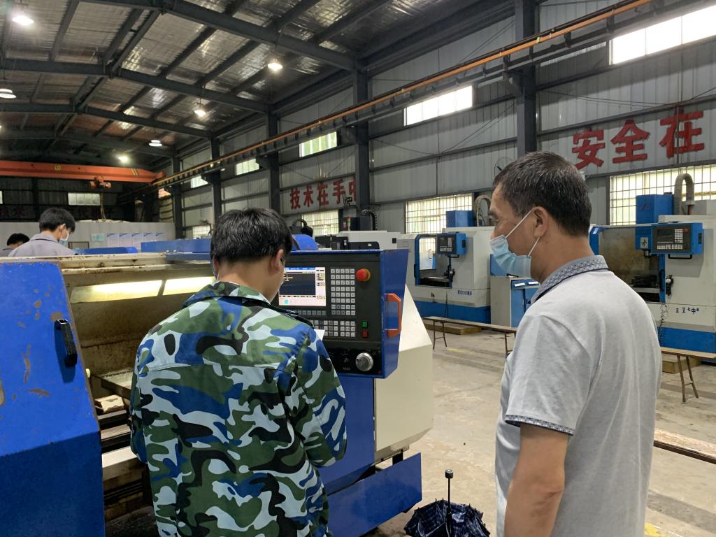 分院副院长陈耀新到比赛现场指导,鼓励学生“不要紧张,安全第一。把图纸看懂,认真完成每一步零件的加工。”