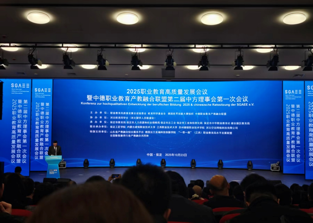 10月22日至24日,2025年首届京雄保职业教育高质量发展大会暨中德职业教育产教融合联盟第二届中方理事会第一次会议在河北保定召开。电气工程学院副院长黄辉受邀参会。会上,我校新增为联盟副理事长单位,还获得了“中德技能大赛合作组织”首批试点培育单位称号。