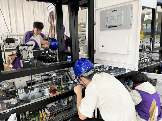 面对时间紧、任务重的挑战,全体师生迎难而上,迅速投入紧张的项目攻坚工作中。项目执行过程中,师生团队分工明确、协同作战,有条不紊推进三大核心任务:一是基础组装,完成800余件标准件精准匹配与组装,搭建起上载具人工焊接、焊接人工检测、焊接检测及点胶、UV固化、固化后CCD检测、人工取料及上铝巴—载具回流6个核心功能机构,保障各部件衔接精度完全符合设备运行标准;二是线路与气路施工,扎实开展动力线路、控制线路的接线端子压接与线路规整工作,同步推进气路布管与规整作业,确保电路导通顺畅、气路密封无泄漏;三是整体调试,完成设备空载试运行、负载测试、精度校准等全流程调试,逐一攻克机构卡顿、信号传输异常等技术难题,最终实现设备各项指标均达到企业验收标准。