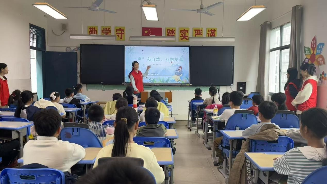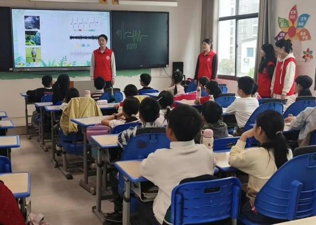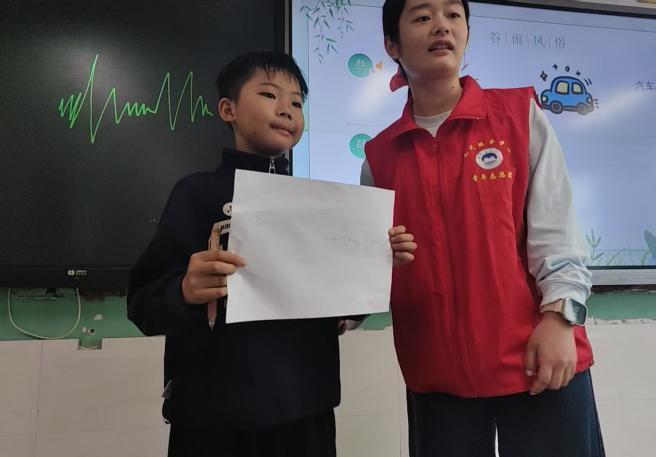 活动中,志愿者们走进教室,展示谷雨相关素材、趣味讲解节气知识,带孩子们走进“雨生百谷”的节气世界。随后,志愿者带领孩子们玩起了“静音观测”小游戏:孩子们集中注意力聆听四段音频,前三段是来自大自然的白噪音,最后一段则是用古琴演绎的经典曲目《高山流水》,通过声波纹记录下每一段声音的起伏变化。古琴温润悠扬的音色,模拟出谷雨时节山涧流水、林下清风的意境,让孩子们在古韵流淌中,感受天籁之音与传统文化的交融。