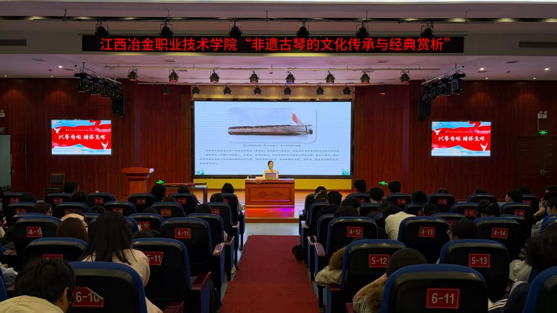 【现代服务学院徐卉报道】2026年4月21日,学校“古琴艺术进校园·传承与经典赏析”主题美育活动在报告大厅举办。活动由现代服务学院承办,分院音乐与舞蹈教研室主任陈雅雯老师主持。活动特邀古琴演奏家、中国古琴专业委员会副秘书长、江西琴会常务理事、中央音乐学院认证古琴高级教师孟洹羽及其团队,以“讲解+演奏”的形式,为师生宣传、介绍古琴文化。