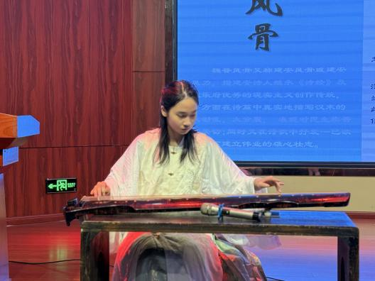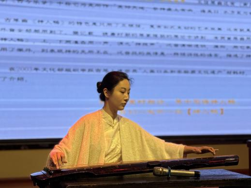 演奏环节,孟洹羽老师携团队为师生合奏了《神人畅》《幽兰操》《梅花三弄》《流水》等经典曲目。