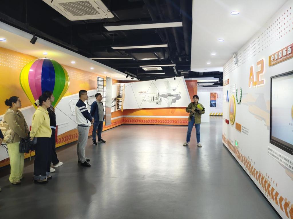 随后,大家移步至人防知识长廊。长廊两侧图文并茂、实物与模型相结合,系统展示了应急避险技能、防空警报识别等内容。讲解员重点解读了中国人民防空标志的设计内涵——金色长城象征国防的坚不可摧,绿色橄榄枝寄托对和平的永恒追求,醒目的“CCAD”字母组合与蓝色三角图形,分别代表人防的专业属性和应急防护的使命担当。教师们驻足细看,不时提问交流。