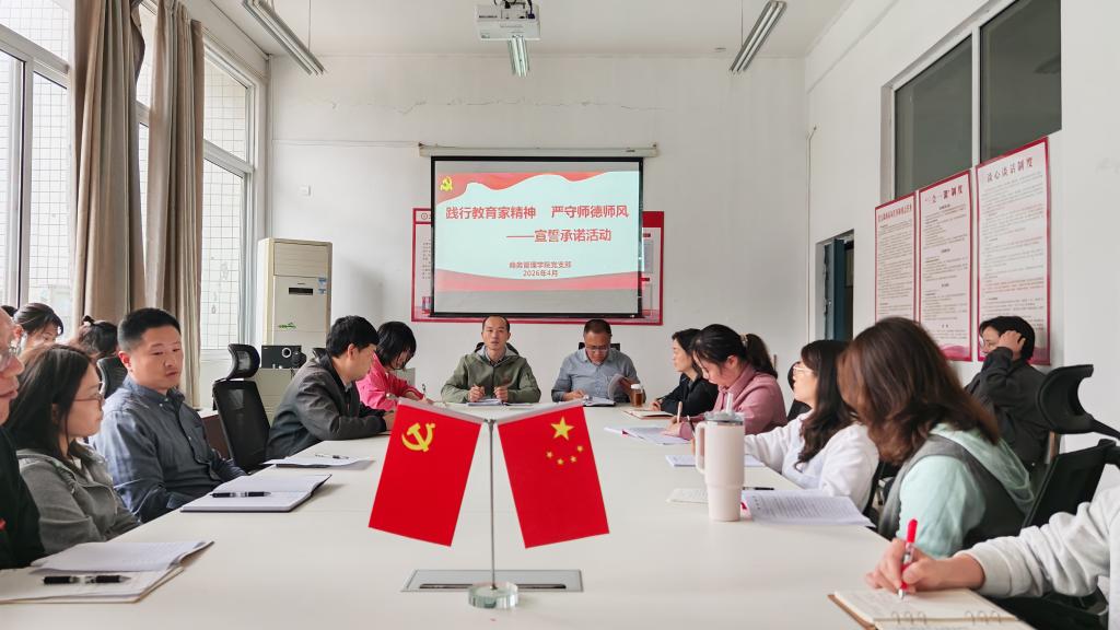 4月21日下午,在南校区三教208室,商务管理学院开展“践行教育家精神 严守师德师风”活动。会议由分院党支部书记唐毓林主持,分院院长郭斌、副书记陈利华、副院长江小美及全体教师参加。会上,全体教师学习了《新时代高校教师职业行为十项准则》《教育部关于高校教师师德失范行为处理的指导意见》等文件精神。观看了全国最美教师的先进事迹视频、警示典型案例。郭斌带领全体教师庄严宣读“教师誓词”,大家认真学习并郑重签署了...