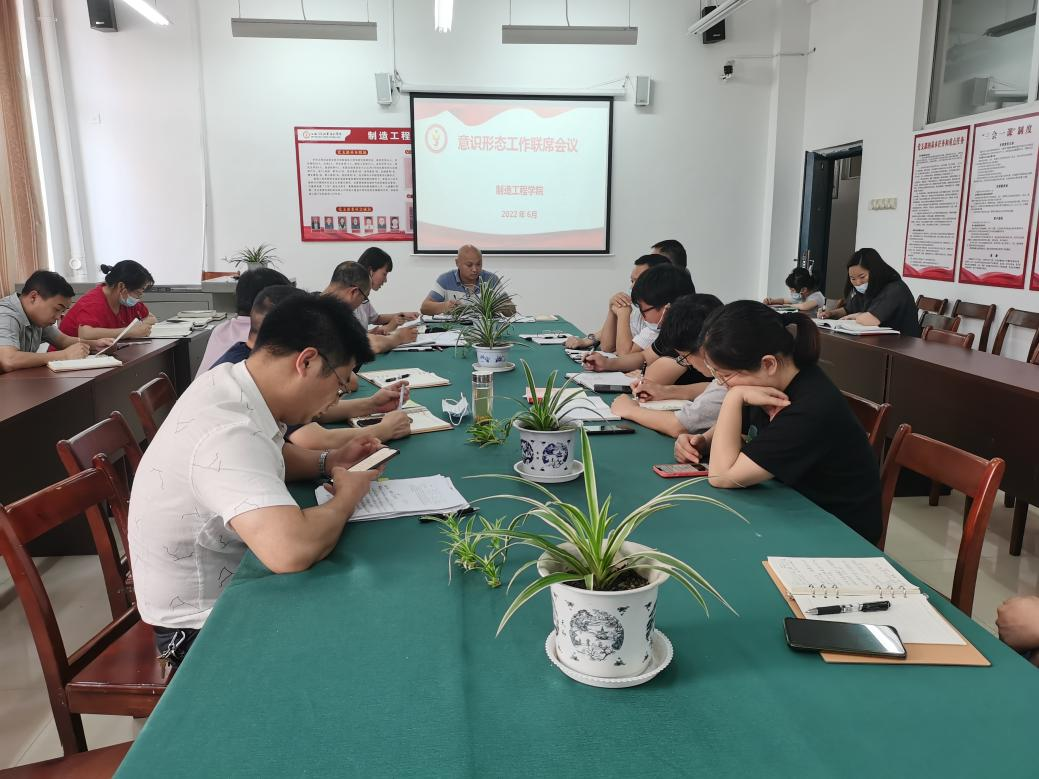 【制造工程学院邹小龙报道】2022年6月7日,制造工程学院在新2教党员活动室召开意识形态专题研判会。会议主要讨论分院第二季度的意识形态工作开展情况。会议由分院党支部副书记邓纪纲主持,支委成员、各教研室主任、团总支书记和黄贤振老师参加。会上,邓纪纲带领大家学习了分院关于意识形态的两个制度文件《制造工程学院意识形态工作季度例会制度》、《制造工程学院意识形态工作联席会议制度》,同时还传达了学校有关意识形态工...